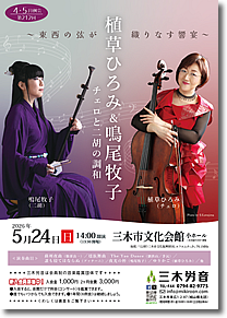 5/9(土)Let's Play the Cello 船橋市勤労市民センター 5/17(日)虹の音楽会第79回ファミリーコンサート〜超チェロ組〜珠玉のチェロアンサンブル(千葉県君津市) 5/24(日)三木労音4・5例会 植草ひろみ&鳴尾牧子コンサート 三木市文化会館小ホール(兵庫県三木市) 9/27(日)きらり!音楽の宝石箱25 超チェロ組コンサート きらりホール(千葉県鎌ケ谷市) 10/10(土)ヒメキリゾート2026 チェロ・ギター duoコンサート 姫木湖畔ステージ(長野県小県郡) 10/24(土)チェロとギターで巡る世界紀行 Vol.3 信濃追分文化磁場「油や」内ギャラリー・一進(長野県北佐久郡) 11/12(木)植草ひろみスーパーチェロコンサート JR仙台病院 1階エントランスホール(宮城県仙台市) 12/6(日)Graceful Cello by 植草ひろみ in 市川市 木内ギャラリー(千葉県市川市) 12/13(日) Graceful チェロ by 植草ひろみ at Café PaPa Xmasコンサート(千葉県習志野市) (上記は詳細が決まり次第このページでお知らせいたします) |
