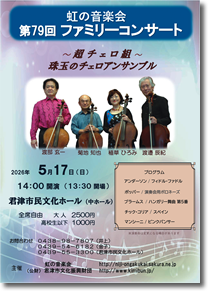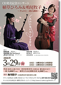 2/28(土)大阪フィルハーモニー交響楽団 枚方公演(大阪府枚方市) 3/29(日)CD発売記念コンサート植草ひろみ&鳴尾牧子〜チェロと二胡の調和〜(千葉県習志野市) 4/11(土)CD発売記念コンサート植草ひろみ&鳴尾牧子〜チェロと二胡の調和〜(兵庫県神戸市) 5/17(日)虹の音楽会第79回ファミリーコンサート〜超チェロ組〜珠玉のチェロアンサンブル(千葉県君津市) 5/24(日)三木労音4・5例会 三木市文化会館小ホール(兵庫県三木市) 9/27(日)きらり!音楽の宝石箱25 超チェロ組コンサート きらりホール(千葉県鎌ケ谷市) (上記は詳細が決まり次第このページでお知らせいたします) |